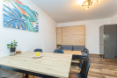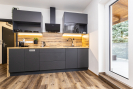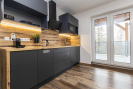 Kuchyňský kout - plně vybavená kuchyňská linka (vestavná mikrovlnná trouba, myčka, varná deska, odsavač par) a rozkládací jídelní stůl