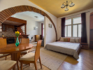 K vybavení náleží kuchyňská linka vybavená vestavěnou plynovou varnou deskou a elektrickou troubou, digestoří, dále volně stojící lednicí s mrazákem a mikrovlnnou troubou. K dispozici je manželská postel s matracemi a rošty, sedačka, jídelní a konferenční stolek, návštěvy mohou přespat na matraci, která je umístěná na vestavěném patře. V bytě je také dostatek úložných prostor, jak v samotném pokoji, tak v chodbě, kde je umístěná velká šatní skříň i s prostorem na pračku.