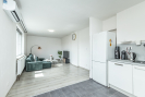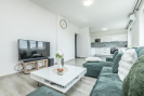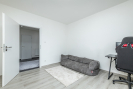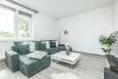 Dispozice bytu nabízí ideální rozložení prostoru: vstupní předsíň, obývací pokoj s kuchyňským koutem, ložnice, dětský pokoj (případně pracovna), koupelna s vanou a místem pro pračku a sušičku a samostatné WC. V obývacím pokoji je instalována klimatizační jednotka. Na podlahách je kombinace plovoucí podlahy a keramické dlažby, okna jsou plastová.