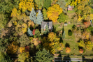 Vzrostlé ovocné stromy a další bujná zeleň.