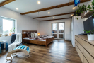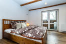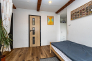 V 1. patře je prostorná ložnice, kterou je možno rozdělit na dvě místnosti, dále dětský pokoj a koupelna se sprchovým koutem a toaletou.