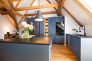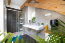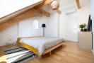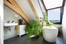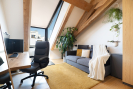 Atypický byt o rozloze 123,5 m2 v nejvyšším podlaží zaujme reprezentativní dispozicí 3+kk a nadstandardním provedením interiéru. Kuchyňská linka s deskou z přírodní žuly Nero Assoluto, americká lednice Samsung s výrobníkem ledu, vestavné spotřebiče (kompaktní a parní trouba, indukční deska) Samsung a myčka Electrolux vytvářejí harmonii elegance a funkčnosti. Designová koupelna s volně stojící vanou i prostorným sprchovým koutem podtrhuje atmosféru luxusního bydlení. Komfort umocňují tři klimatizační jednotky Toshiba.