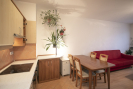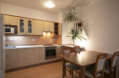 Kuchyňský kout je plně vybavený vestavěnou elektrickou varnou deskou, troubou, digestoří i myčkou nádobí, lednice je samostatně stojící. Je tu jídelní stůl s židlemi.