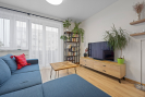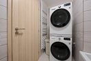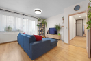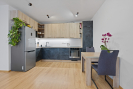 Interiér je vybaven na míru, kuchyňská linka v kombinaci černé barvy a dřeva se spotřebiči působí elegantně a funkčně zároveň. Celý byt působí čistě, svěže a je připraven k okamžitému nastěhování bez nutnosti dalších investic.
