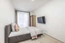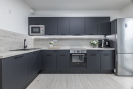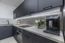 Dispozice bytu je velmi praktická a nabízí vysoký komfort pro každodenní život. Dominantou bytu je prostorný obývací pokoj s kuchyňským koutem, který je vybaven moderní kuchyňskou linkou včetně vestavěných spotřebičů. Celý prostor je vzdušný a díky velkoformátovým oknům a jihozápadní orientaci velmi světlý po celý den. Předokenní žaluzie pak zajistí dostatečnou ochranu před horkým letním sluncem a dodají i maximální míru soukromí.