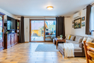 Srdcem celého domu je v přízemí situovaný obývací pokoj s kuchyňským koutem o velkorysé výměře téměř 40 m². Kuchyně je navíc doplněna o praktickou a prostornou spíž. Z obývacího pokoje lze plynule přejít na venkovní terasu, která propojuje interiér se zahradou. Přízemí dále nabízí pokoj o velikosti 11 m², který lze využit třeba jako pokoj pro hosty. Dále pak koupelna s vanou, sprchovým koutem a toaletou. A nakonec zde najdeme samostatnou technickou místnost s dostatkem prostoru pro pračku i sušičku.