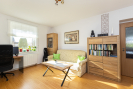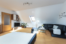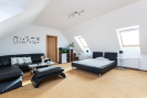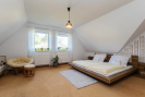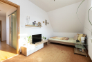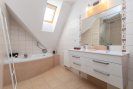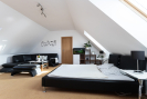 V patře se nachází ložnice, dva prostorné pokoje (jeden s vlastní šatnou) a koupelna s vanou, sprchovým koutem, dvěma umyvadly a samostatným WC. Všechny místnosti mají vstup z prostorné chodby. Podkroví nabízí bohatý úložný prostor.