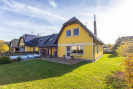 V přízemí vás přivítá vstupní předsíň a velkorysý obývací pokoj s krbem a přímým vstupem na terasou. Na něj navazuje moderní kuchyňský kout s plně vybavenou linkou, jídelním prostorem a praktickou spíží pod schodištěm. Dále zde najdete samostatný pokoj, koupelnu se sprchovým koutem a WC, technickou místnost a garáž s elektrickými vraty s přístupem přímo do domu i na zahradu.