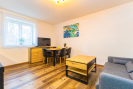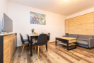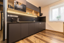 Kuchyňský kout - plně vybavená kuchyňská linka (vestavná mikrovlnná trouba, myčka, varná deska, odsavač par) a rozkládací jídelní stůl