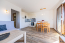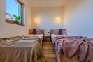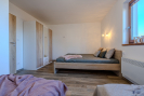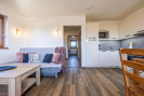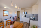 Pokoj s kk má rozkládací sedací soupravu, kuchyňská linka s vestavnými spotřebiči, ložnice s manželskou postelí a skříní + dvě samostatné postele, v zádveří skříň a odkládací plochy.