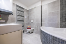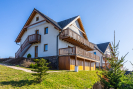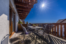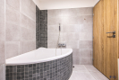 Koupelna s rohovou vanou a otopným žebříkem. Výstup z pokoje na prostornou terasu s nádherným výhledem do údolí a na hřebeny Jeseníků.