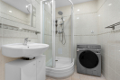 Vybavení bytu je promyšlené a funkční. Na podlahách je položena plovoucí podlaha a v chodbě jsou instalovány velké šatní skříně s velkorysým úložným prostorem. Moderní kuchyňská linka disponuje myčkou i prostornou lednicí a koupelna je vybavena větším sprchovým koutem a pračkou. Osvětlení celého bytu je řešeno vkusnou kombinací bodových světel a lustrů.