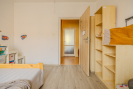 Odstraněním části příčky mezi obývacím pokojem a kuchyní je možno přebudovat na dispozici 3+kk a zvětšit koupelnu, vznikne tak prosvětlenější a větší prostor v hlavní obytné části bytu, pokoje jsou situované za obývacím pokojem.