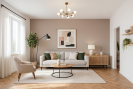 Dispozice, obývací pokoj, velká světlá místnost se zkosenou stěnou a rohovými okny. Poskytuje dostatek prostoru pro sedací soupravu, TV koutek i pracovní zónu, velkorysá ložnice vhodná pro manželskou postel, šatní skříně i relaxační koutek, druhý pokoj prostorný a dobře prosvětlený pokoj - ideální jako dětský pokoj, pokoj pro hosty nebo pracovna.