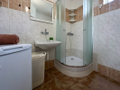 Byt má samostatný vchod. Od silnice se uzamykatelnou brankou vchází na zatravněný menší pozemek, kde je možné po stranách vysázet květiny, pěstovat v truhlíkách např. rajčata, jahody, bylinky...., dát dětem pískoviště, lavičku k posezení, případně i gril. Z přízemí se po dřevěných schodech dostaneme do prostorné předsíně, kde je vchod na samostatné WC, do koupelny se sprchovým koutem, WC, pračkou a kotlem a dále pak vstupujeme do obývacího pokoje s kuchyňským koutem, vyrobeným na míru a vybaveným myčkou, indukční 2 plotýnkou, mikrovlnnou troubou s grilem, nerezovým dřezem a digestoří.