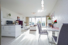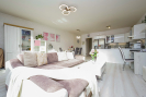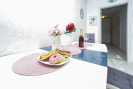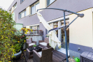 Vyvýšený obývací pokoj s kuchyňským koutem orientovaným na jižní stranu s výměrou 39m2, kde místnost je po celý den krásně prosvětlená, s přímým vstupem na 25m2 terasu, která rozšiřuje obytný prostor o další příjemnou venkovní zónu. Terasa navíc sousedí pouze se stezkou pro pěší.