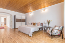 (16,32 m2), z níž se vchází vpravo do 2 neprůchozích pokojů (obývací pokoj 27,84 m2 a ložnice 27,84 m2), do spíže (3,74 m2) a do kuchyně (15,84 m2) s moderní rohovou kuchyňskou linkou a jídelním stolem. Přes kuchyň se dostáváme do chodby (7 m2), spojující obytnou část přízemí s technickým zázemím domu (dílna 12,22 m2, garáž 16,45 m2 a ateliér 13,33 m2). Z chodby se také vchází na samostatné WC a do koupelny (6 m2) s WC, bidetem a sprchovým koutem.