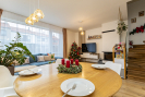 V přízemí domu o celkové ploše 56,56 m² se nachází světlý obývací pokoj se vstupem na terasu a zahrádku, orientovaný na východ, který poskytuje příjemné ranní světlo. Terasa je vybavena elektrickou markýzou, která zajišťuje komfortní zastínění a umožňuje její plnohodnotné využívání i v horkých letních dnech. Součástí obytného prostoru je kuchyňský kout s orientací na západ, dále nově vybudovaný krb, jenž dodává interiéru útulnou atmosféru. V přízemí je rovněž vstupní chodba se šatnou, technická místnost a samostatná toaleta. Komfort bydlení zvyšuje podlahové vytápění ve spodním patře domu.