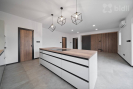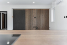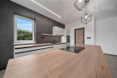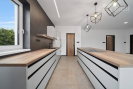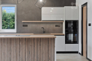 Kuchyňská linka je vyrobena na míru a osazena kvalitními spotřebiči (např. Franke - varná deska s integrovaným odsáváním). Velkou výhodou je samostatná spíž přístupná přímo z kuchyně.