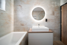 Koupelny jsou provedené ve vysokém standardu: velkoformátové obklady, podomítkové baterie Hansgrohe, keramika Ideal Standard / Vitra, skříňky na míru, zrcadla a elektrická otopná tělesa. Jedna koupelna nabízí sprchu i vanu, druhá nadstandardně velkou vanu + WC.