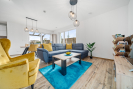 prostorný a světlý obývací pokoj s kuchyňským koutem a přímým vstupem na terasu a zahradu