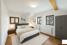 V patře jsou čtyři samostatné ložnice, koupelna s vanou, sprchovým koutem a WC a úložný prostor na půdě.