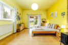 Rodinný dům stojí v oplocené zahradě a obytné místnosti směřují především jižním a západním směrem. Z ložnice se vchází na venkovní dlážděnou terasu.