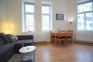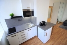 Byt je plně vybaven - k dispozici je kuchyňská linka se spotřebiči, lednice, pračka, jídelní stůl se židlemi, rozkládací pohovka, skříň a koupelna se sprchovým koutem.