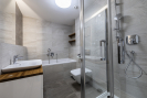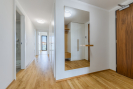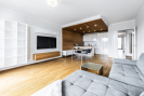Celková plocha bytu je 97,1 m2 a jeho dispozice je tvořena obývacím pokojem se vstupem na prostorný balkon, sedací soupravu jídelní částí s kuchyňským koutem vybaveným spotřebiči značky Samsung - lednice, mrazák, myčka, varná deska, pečící trouba, odsavač par. V ložnici se nachází postel s vysokou matrací pro větší komfort na spaní a prostorná šatní skříň, ve druhé ložnici nalezneme prostornou šatnu a balkon, který je přístupný z obou pokojů. V koupelně je umístěná vana, sprchový kout a toaleta, další toaleta v bytě je samostatná. Prostorná komora kombinuje úložné prostory s technickou místností (pračka a sušička zn. Miele je součástí vybavení). Podlahy dřevěné z dubu a dlažba, velkoformátová 3-vrstvá okna (s automaticky stahovacími roletami při špatném počasí) dodávající bytu vzdušnost a příjemnou atmosféru.