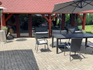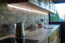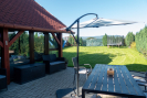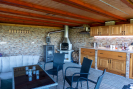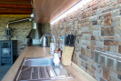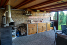 V přízemí je moderně zařízená kuchyně s výhledem na zeleň, dizpozice, plotýnka, vestavěná lednice, kamna, mikrovlná trouba. Chata je napojena na elektřinu i vodu a připravená pro vytápění krbovými kamny, což umožňuje komfortní využití i mimo letní sezónu.