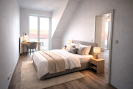 Na obývací místnost navazuje soukromá ložnice, která je zdokonalena nejen prostorem pro pracovnu, ale i oddělenou prostornou šatnou. Úložné prostory jsou v tomto bytě opravdu štědré, a to i díky velkému půdnímu prostoru.
