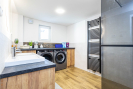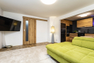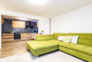 Dominantou přízemí je prostorná kuchyně propojená s obývacím pokojem, oddělená posuvnými dveřmi. Kuchyňská linka je vyrobena na míru a vybavena vestavěnými spotřebiči - elektrickou troubou, mikrovlnnou troubou, myčkou nádobí a velkou lednicí. Samozřejmostí je odsavač par s vývodem mimo dům. Okno v kuchyni zajišťuje dostatek denního světla a vzdušnost prostoru. V přízemí se dále nachází další samostatný pokoj.