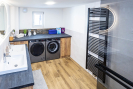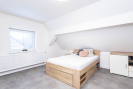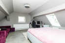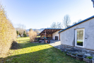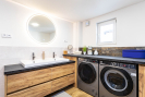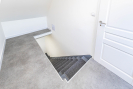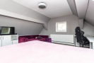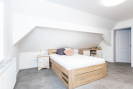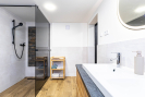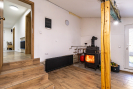 Ve sníženém suterénu se nachází technická a multifunkční část domu. Je zde podlahové vytápění (stejně jako v koupelně), krbová kamna s rozvody do ústředního topení, plynový kotel značky Baxi a bojler. Prostor lze využít například jako šatnu, technickou místnost nebo venkovní kuchyni. Ze suterénu je přímý vstup na zahradu. Dále se zde nachází praktická komora vhodná pro úklidové potřeby či vysavač. Součástí domu je samostatné WC s oknem a moderní koupelna se zapuštěným sprchovým koutem, dvěma umyvadly a koupelnovým nábytkem na míru, do kterého je elegantně integrována pračka se sušičkou. I koupelna disponuje oknem. Do patra se vstupuje po dřevěném schodišti. V horním podlaží se nachází dva velmi pěkné pokoje se šikminami, jeden z nich je vybaven klasickým i střešním oknem. Ve všech místnostech jsou bílé interiérové dveře a podlahy z lina. K domu náleží zahrada o výměře cca 723m2, na které se nachází přístavek na dřevo a prostor pro venkovní posezení. Obytná plocha domu činí přibližně 186 m2.