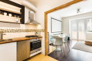 Kuchyně je prakticky oddělená a vybavená kuchyňskou linkou se spotřebiči.