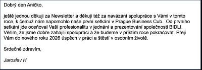 ještě jednou děkuji za Newsletter a děkuji též za navázání spolupráce s Vámi v tomto roce, k čemuž nám napomohlo naše první setkání. Od prvního setkání jsem oceňoval Vaší profesionalitu v jednání a prezentování společnosti BIDLI. Věřím, že jsme dobře zahájili spolupráci a že budeme v příštím roce pokračovat. Přeji Vám do nového roku 2026 úspěch v práci a štěstí v osobním životě.
